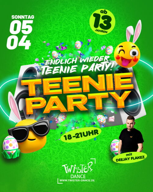 Hey Leute – seid ihr ready für den ultimativen Abend? 😍 Ab 18 Uhr öffnen wir die Tore zur TEENIE PARTY, und dann heißt’s: Vibes on, Alltag off! Eine Nacht voller Beats, Fun & gemeinsam eskalieren.